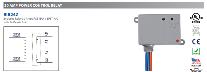 Relay In a Box (RIB) Power Series controls most BAS, HVAC, low-horsepower motor and lighting applications. The relays come mounted and pre-wired in a housing, saving the installer the time, trouble and expense of buying separate components (relay, socket, mounting rail, and enclosure) and assembling them on the job or at the shop. The RIB Power Series has a protruding 1/2" or 3/4" NPT nipple from which all wires exit (except T series). To install, remove a conduit knockout in the equipment, insert the wires and nipple through the hole, tighten the locknut, and connect the wires. RIB Power Series - 20, 30A Relays The RIB Power Series has relay contacts rated for 20 and 30A. They require modest coil drive current and are used for direct switching and control of heavy electrical circuits, such as large resistive, motor, and lighting loads. RIBT Series - High/Low Voltage Separation The RIBT Series is designed to provide physically separate entrances for connections to the relay input coil and output contacts. Relay contact wires exit the housing through a 1/2" or 3/4" NPT nipple. The cover of the RIBT Series is removable and, with star bushings or 1/2" conduit, the coil drive wires can enter the housing through one of two convenient openings.